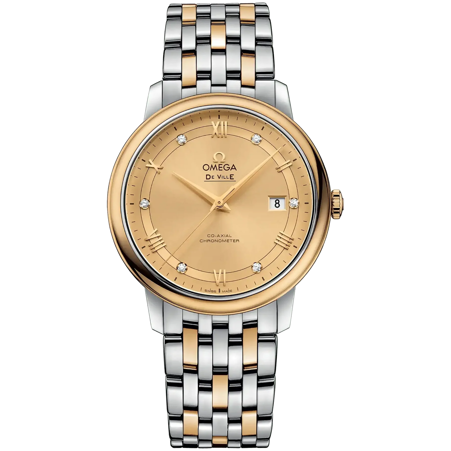 This Omega De Ville PRESTIGE - CO-AXIAL CHRONOMETER watch has a 39.5mm stainless steel 18K Yellow gold case. This model also features an automatic movement, stainless steel bracelet with yellow gold, sapphire anti-reflective crystal and a sun-brushed champagne dial with diamonds. It has a water resistance of 30m